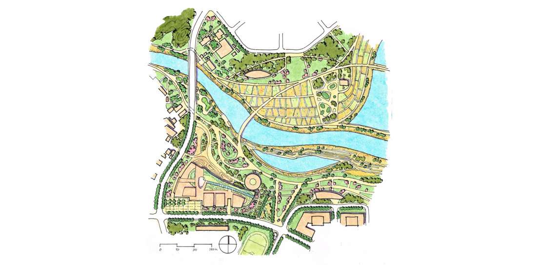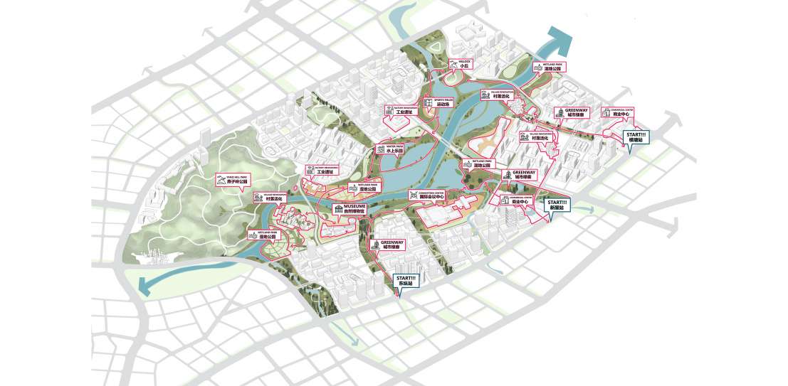 A series of scenic ponds and streams are created to enhance the river corridor’s capacity to slow, detain and organically filter runoff from seasonal monsoons. The open space network provides recreational linkages, wildlife habitat and scenic amenities integrated with a new transit system and islands of development activities including preserved villages, cultural and educational facilities, new innovation districts, mixed-use areas and a conference center hotel & waterside recreation village.