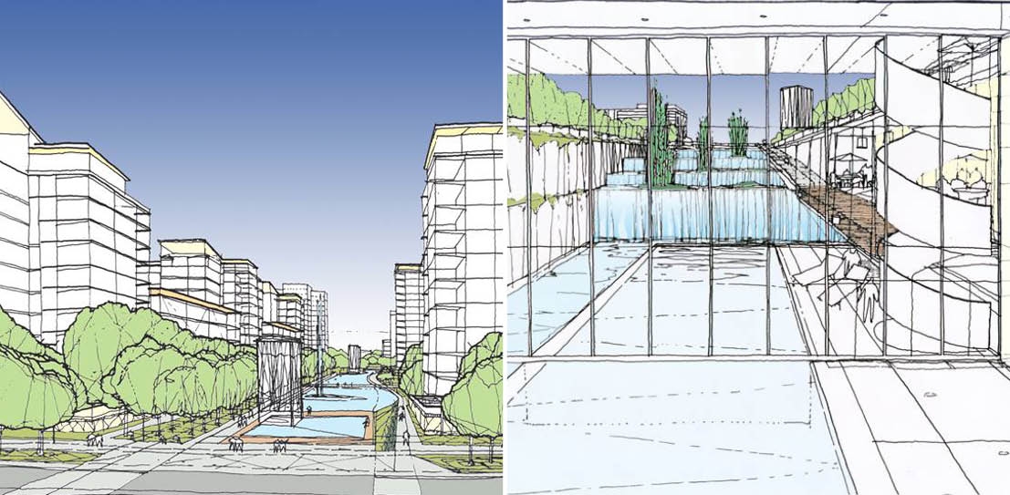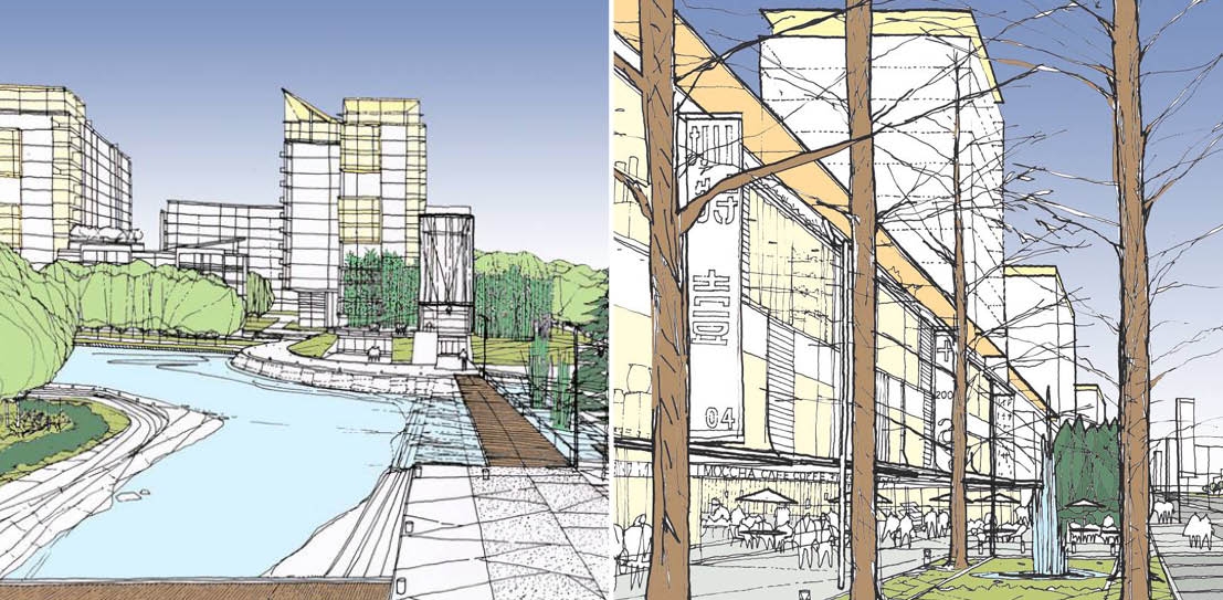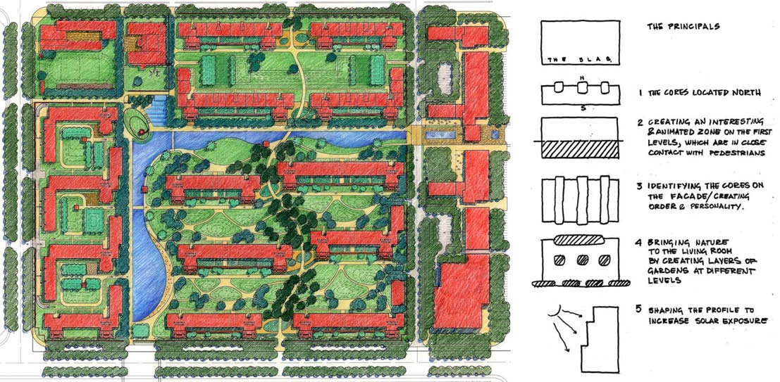 Master planning and conceptual design services for a new 16.2 hectare residential community with retail, recreational and commercial uses integrated at perimeter and gateway locations. Designed with respect for stringent solar access regulations, the residential buildings are arranged to define garden courtyard environments and to relate to each other as neighborhood groups. A clubhouse cafe positioned along a cascading water feature combines with sunken courtyards, pathways and vertical light-wells to connect buildings, gardens and the underground parking garage.